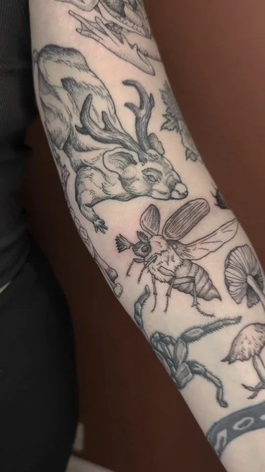 I began my apprenticeship in October 2020 in Jersey, C.I. after completing my Level 3 Diploma in Art and Design at Highlands College. Towards my Diploma I explored surrealism through the Dadaist Movement and the collages of Hannah Hock; and environmental activism- centred installation pieces. Working outside of standard canvases translated beautifully to working on skin, and familiarised me with working in a three dimensional space. These projects also gave me tools to explore narrative in art, which I use now to create flash entrenched with meaning and symbolism. Tattoos by no means must have a meaning, but I find research and intention in my design process create a more cohesive final piece for you.